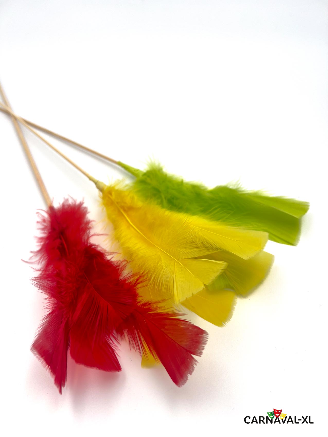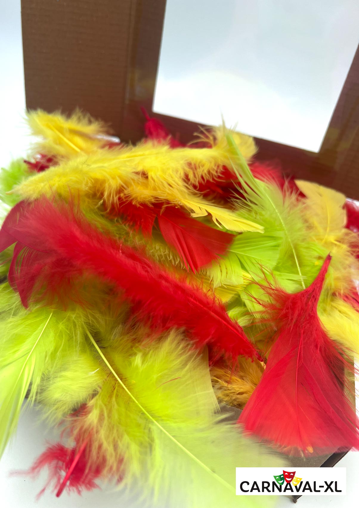 Doosje met losse veertjes rood-geel-groen +/- 15 gram