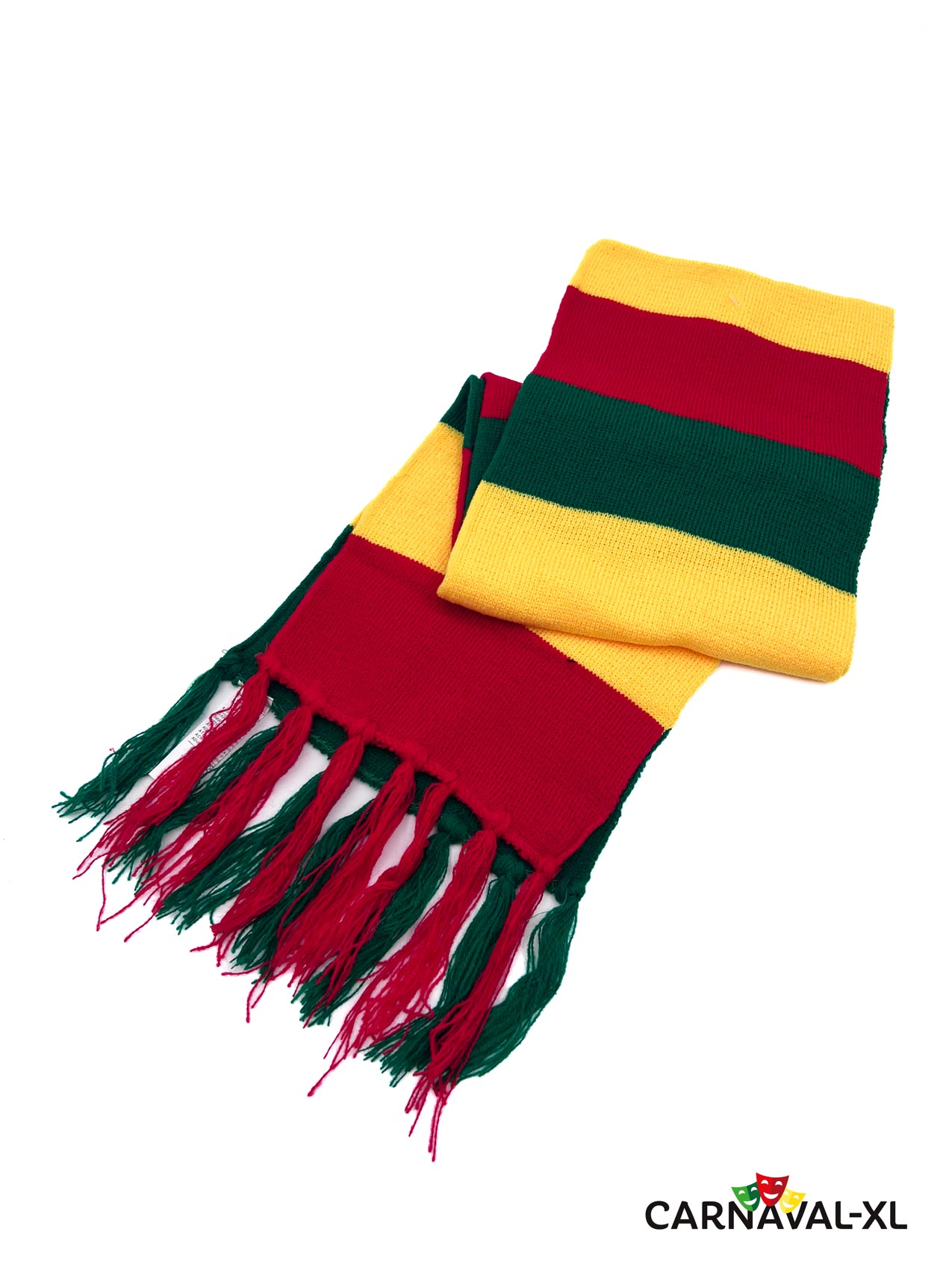 Warme gebreide sjaal met franjes in de kleuren rood-geel-groen. Leuk om te dragen of te gebruiken als decoratie.