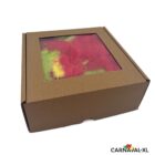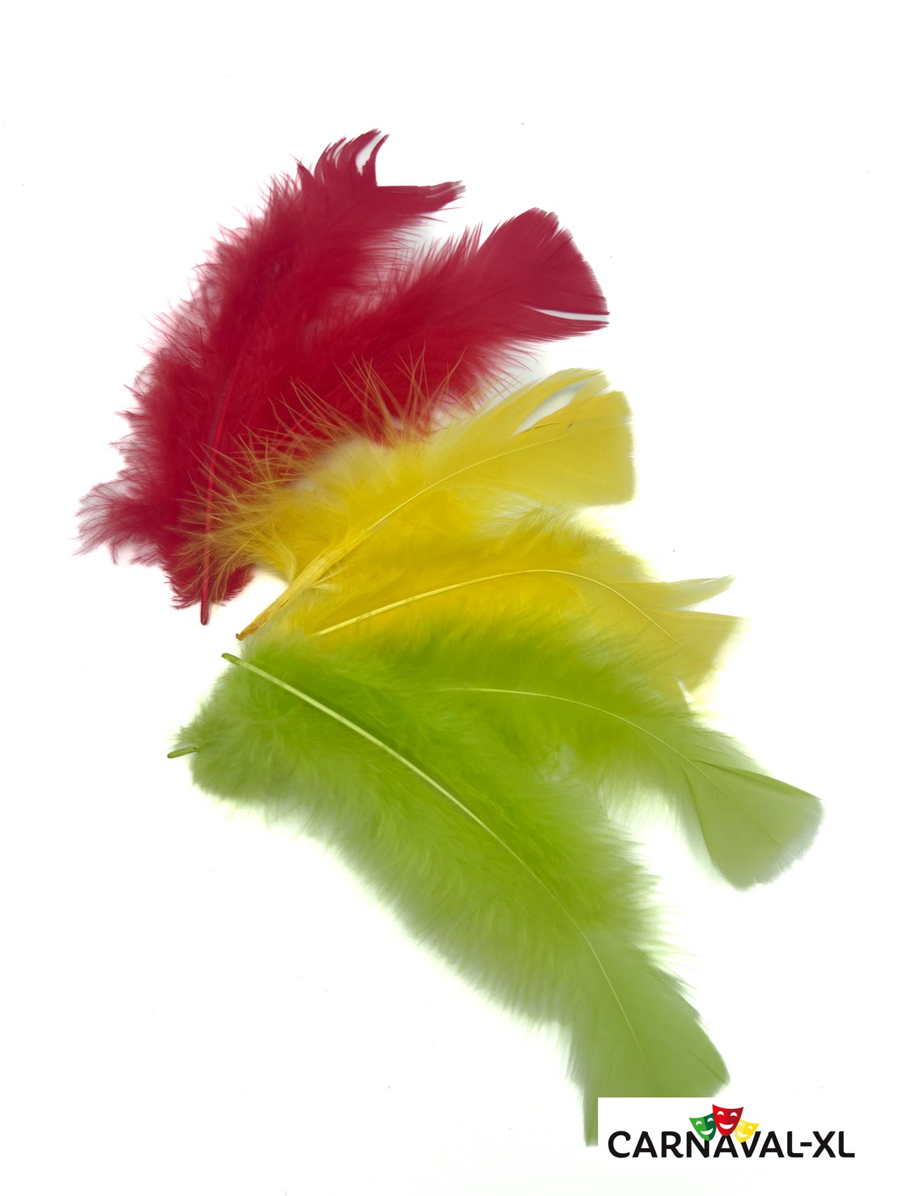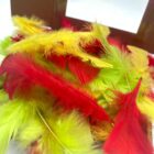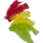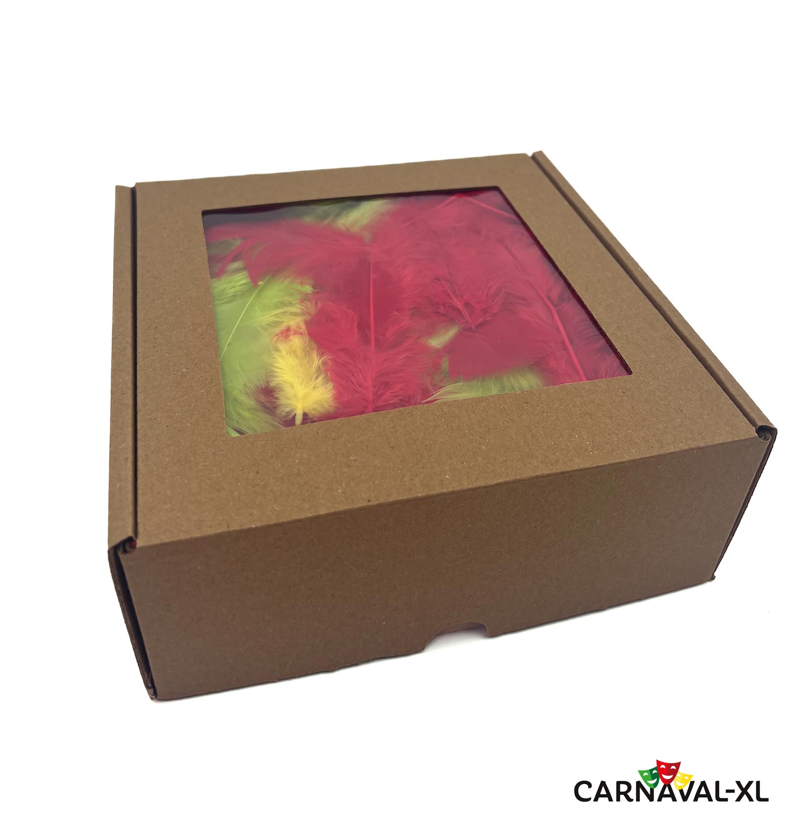 Doosje gevuld met zachte veertjes in de kleuren rood-geel-groen, inhoud ca. 15 gram