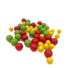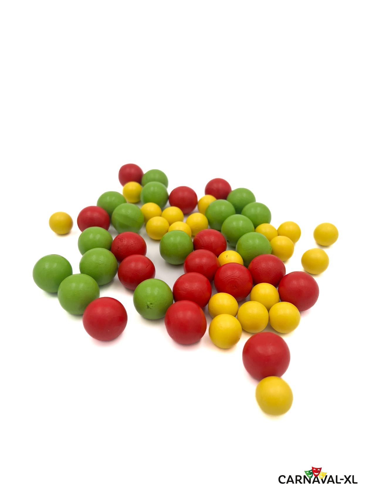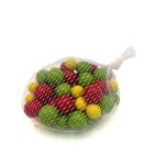 Netje met ca. 40 houten bolletjes in doorsnede varierend tussen 1 en 2 cm in de kleuren rood-geel-groen.