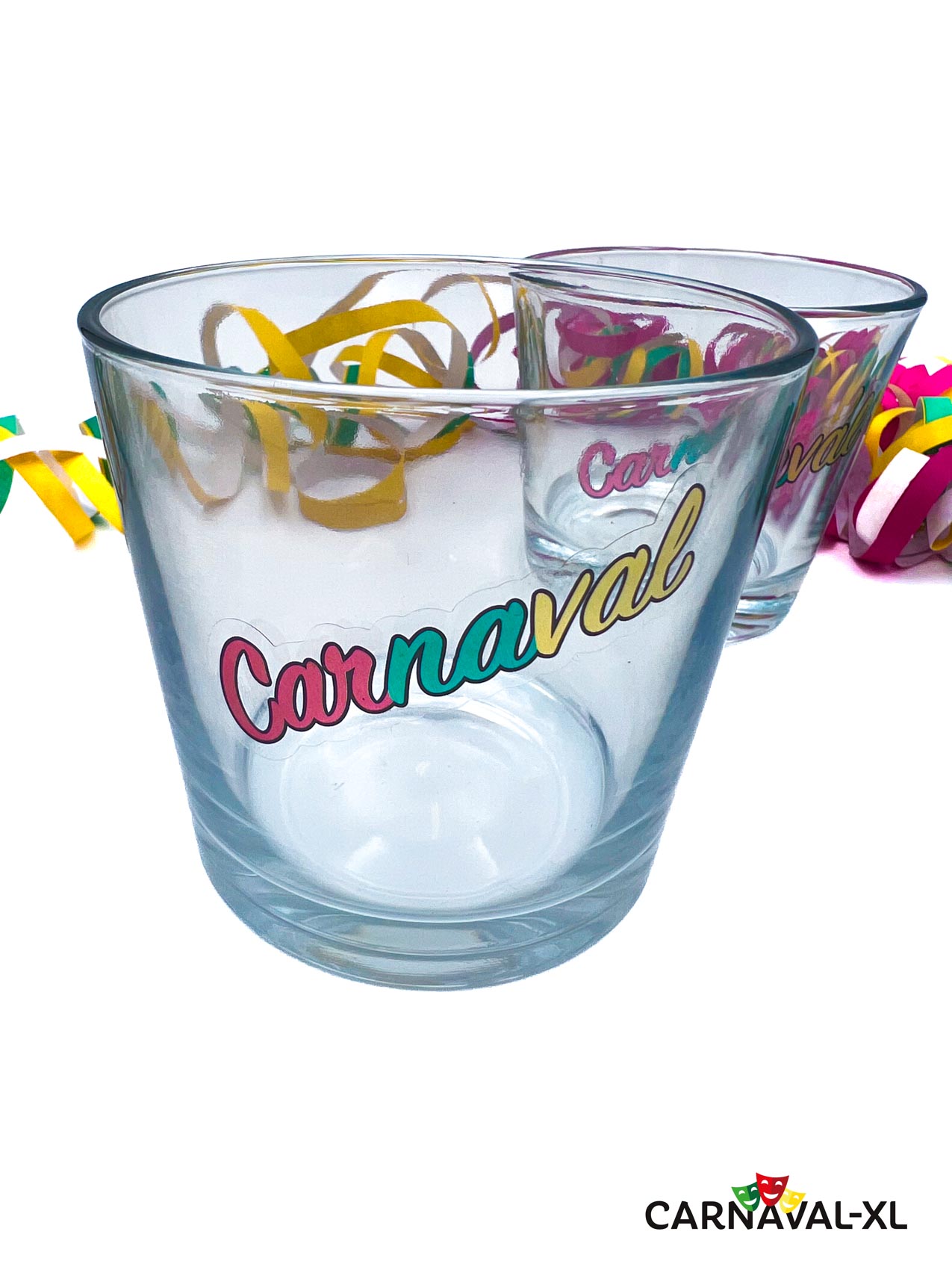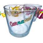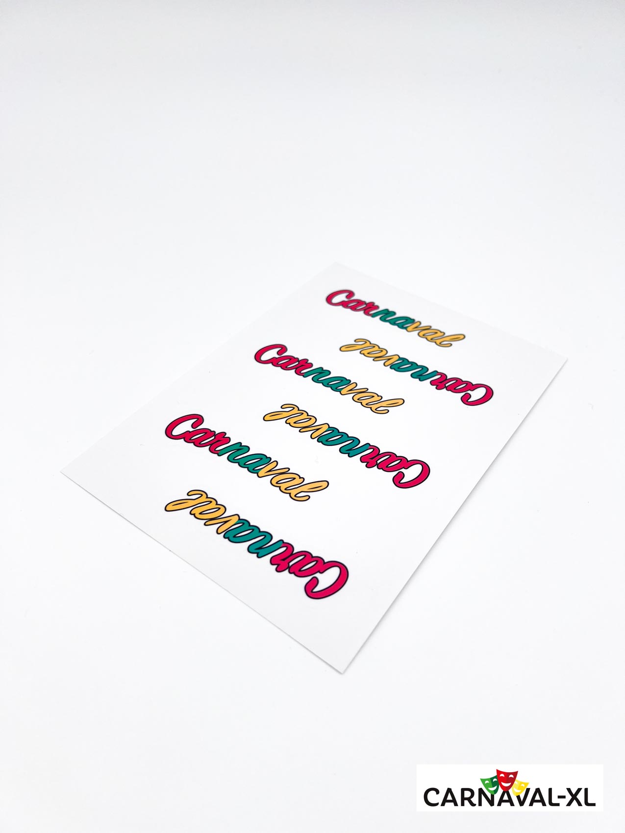 Set van 6 transparante en hebruikbare stickers tekst “carnaval” in rood-geel-groen. Superleuk als decopratie van drinkglas, of theelicht.